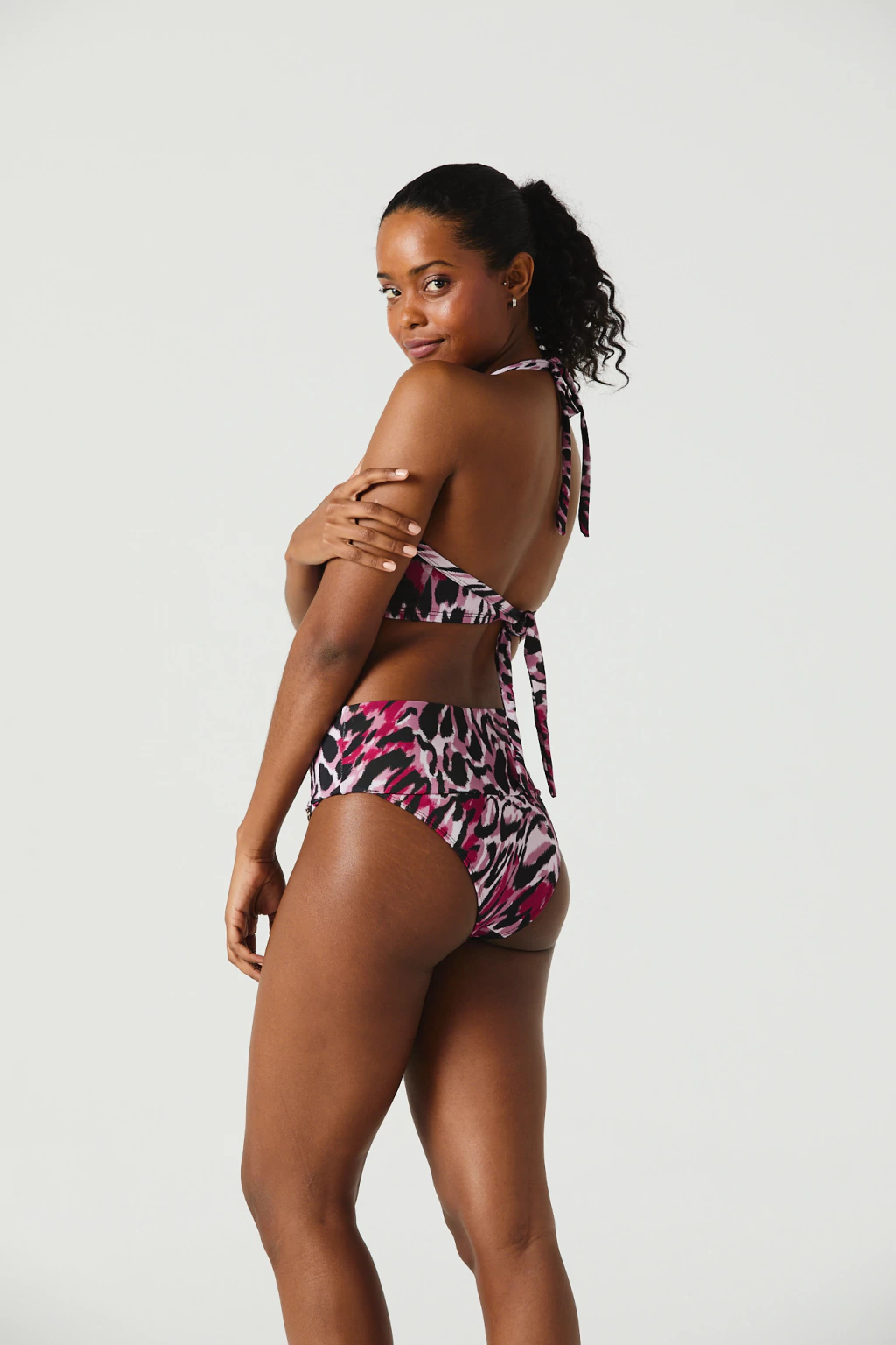 El conjunto incluye un corpiño con nudo frontal y taza soft desmontable, adaptándose a tus necesidades. La vedetina alta y ancha de costado, con frunce delantero y doble tela forrada, realza tu figura y asegura mayor confort.